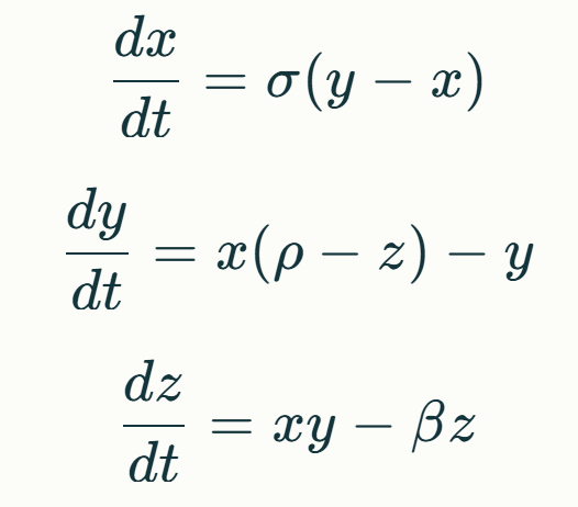 여기서 x, y, z는 시스템의 상태를 나타내는 변수이고, σ, ρ, β는 시스템 매개변수입니다.